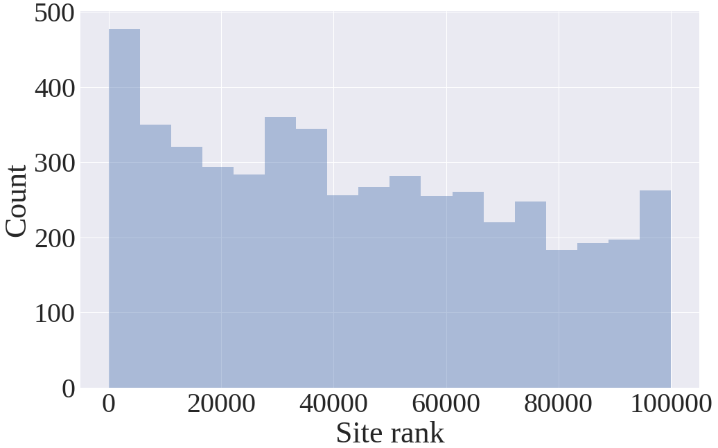 In addition to listing the number of sites that feature scripts, we use the prominence metric proposed by Engelhardt and Narayanan (§5.2) to capture the popularity of the sites where scripts are present. It is calculated as the inverse sum of the rank of the sites: \( \sum 1/\mathit{rank}_i \). For ease of interpretation, we normalize this by dividing by the prominence of all sites, \( \sum_{i=1}^{100000} 1/i, \) and expresss the value as a percentage.